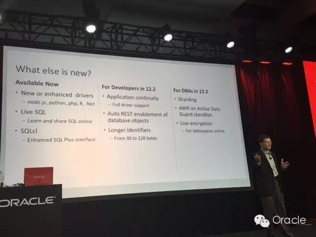 大家还记得我昨天的文章,在Larry的Keynote中,Oracle数据库也放在最后,用了很少的篇幅和时间简要的介绍了数据库的新特性。而今天其实在Andy的主题中,我们所关注的很多特性,包括Sharding,也仅仅在接近最后的一页PPT中,露出一行小字,而且是在Else当中。