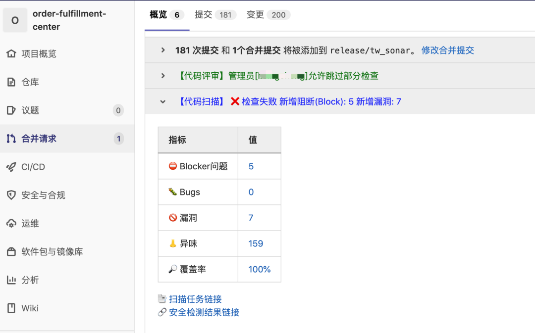 为了让开发者重视安全问题,该检测结果还会同步输出在Gitlab Merge Request处,当Reveiew代码时,将会直接看到安全检测相关结果。