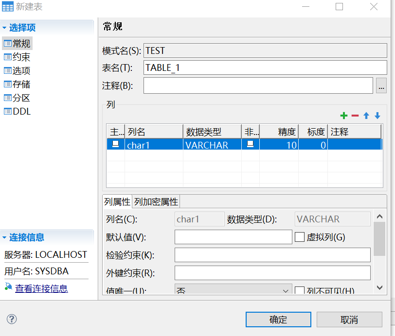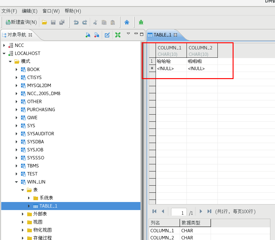CREATE SCHEMA "WIN_LIN" AUTHORIZATION "SYSDBA";CREATE TABLE "WIN_LIN"."TABLE_1"("COLUMN_1" CHAR(10),"COLUMN_2" CHAR(10));insert into WIN_LIN.TABLE_1 VALUES('哈哈哈','啦啦啦');commit;