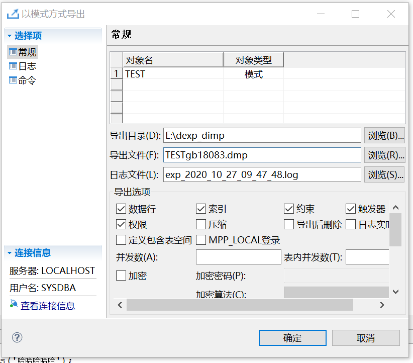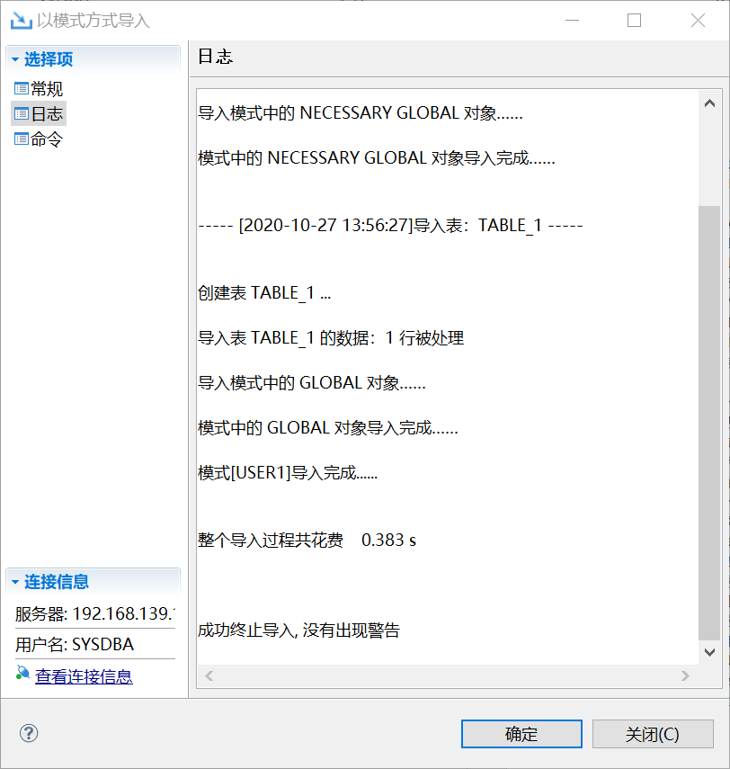 实例2创建新用户USER1,创建表和插入数据,使用SYSDBA导出新用户模式。