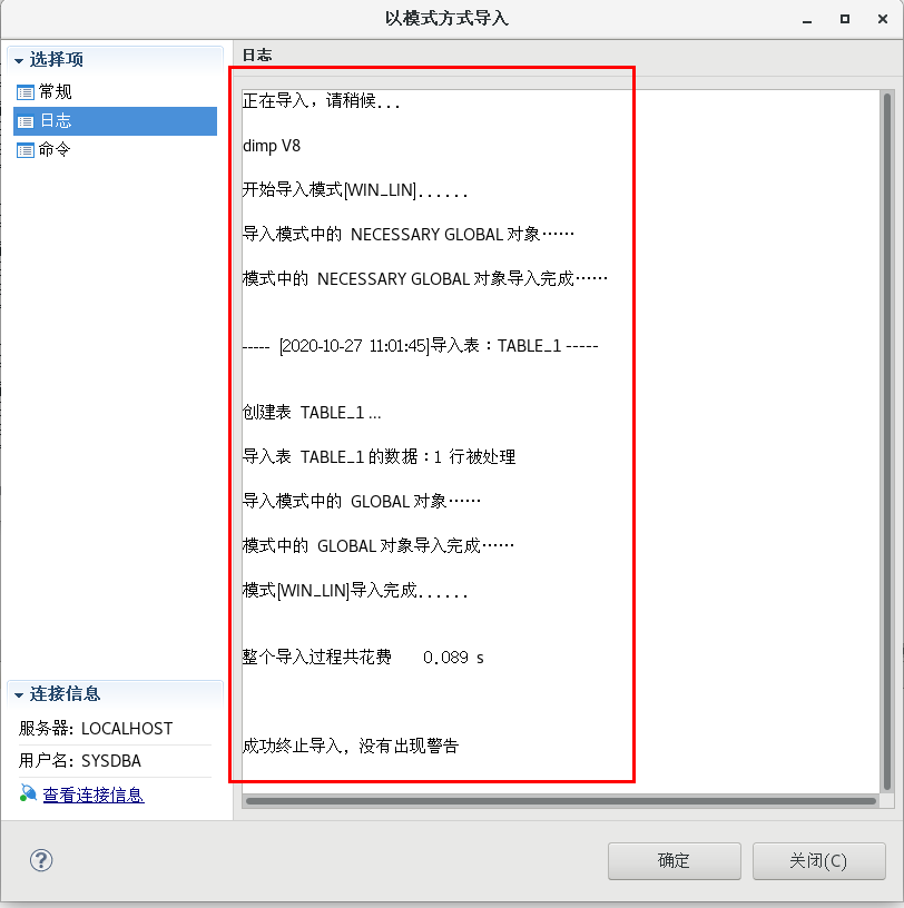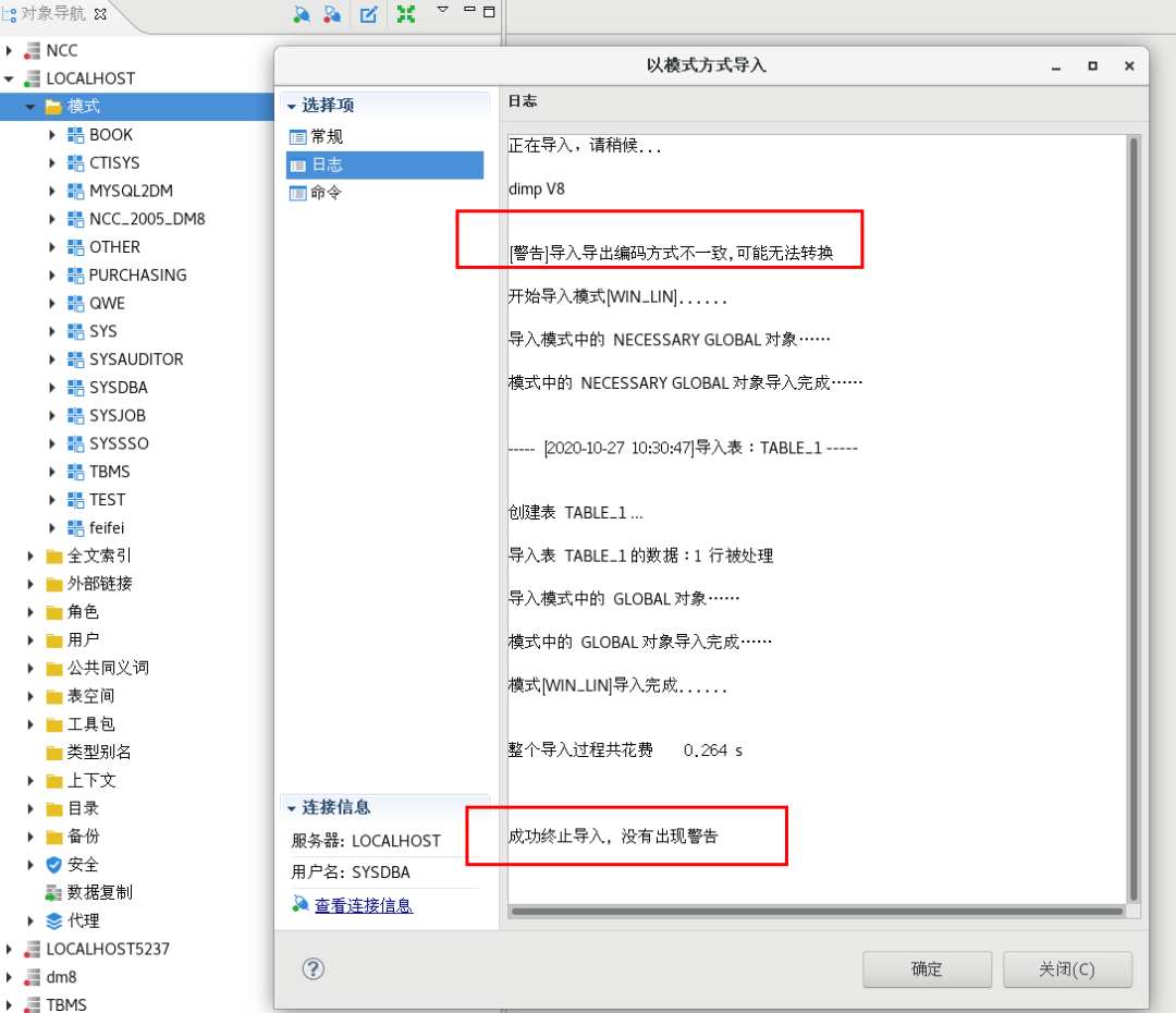这种虽然导入成功,但是建议开个终端可以临时设置linux字符集为gbk,然后在这个终端启动管理工具或者使用命令行dimp导入。下面进行测试是否有导入导出字符集不一致警告。