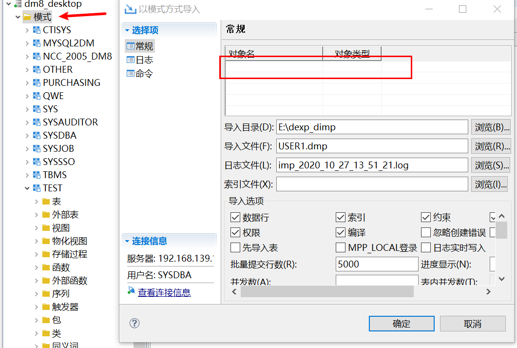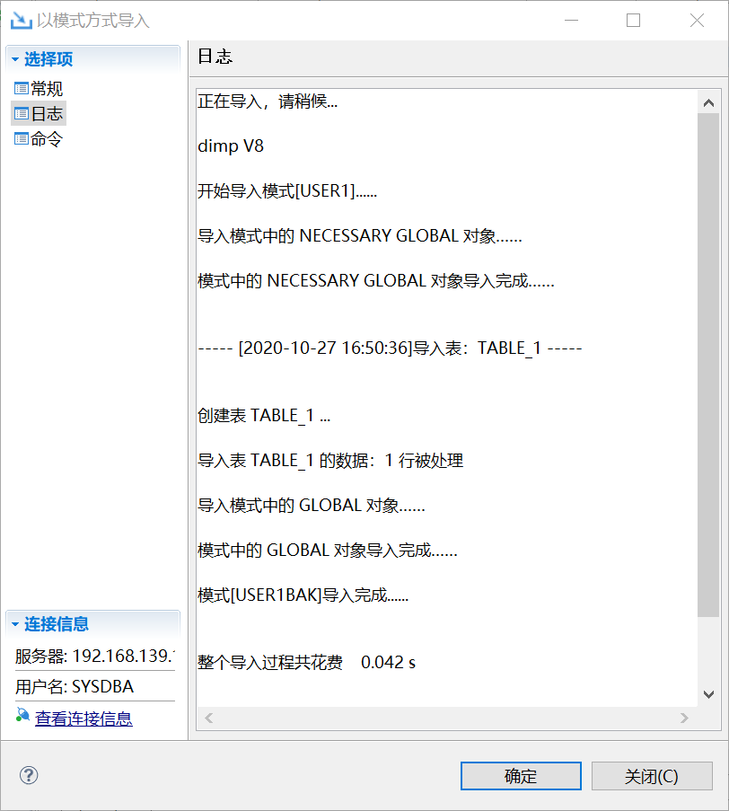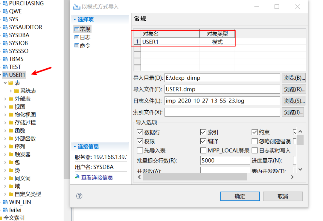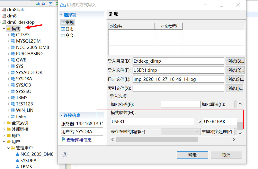 举例:源库导出的是USER1模式,目的端导入时可以更改模式名,如把USER1改为USER1BAK;