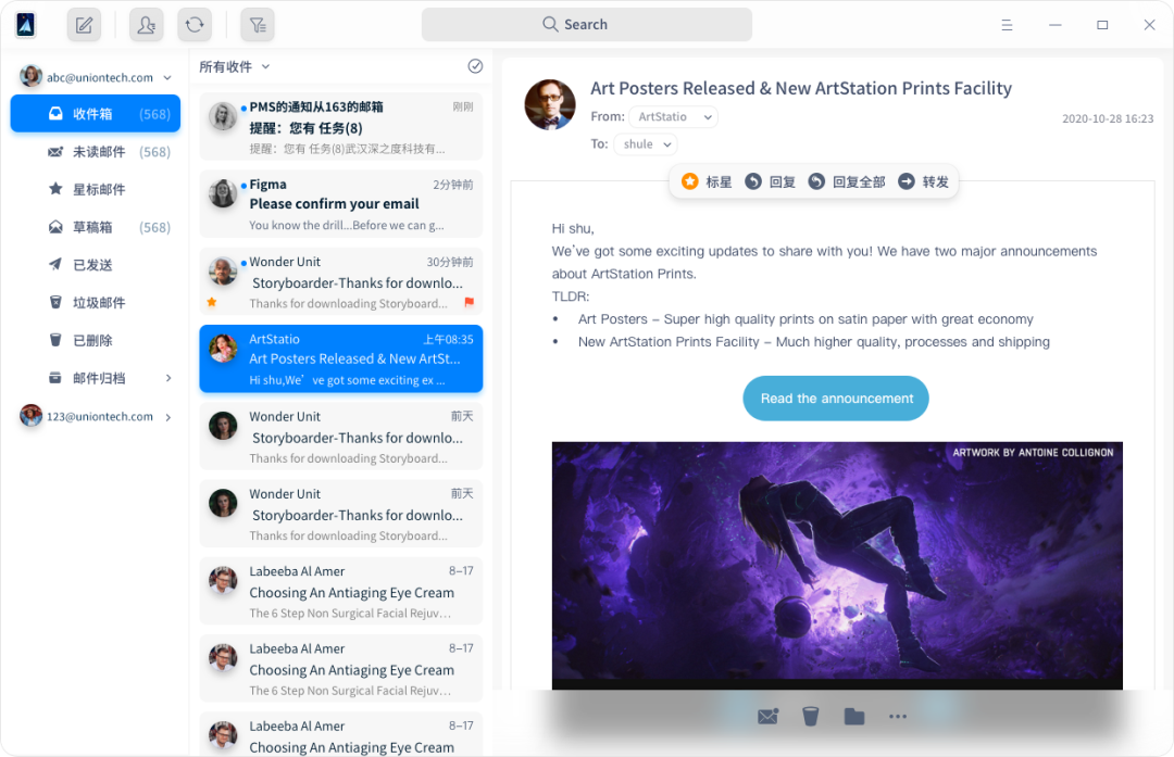 邮箱客户端支持多邮箱帐号,支持常用通信协议如POP3、IMAP、SMTP。收发及时,抄送、转发、草稿等基本功能一应俱全。