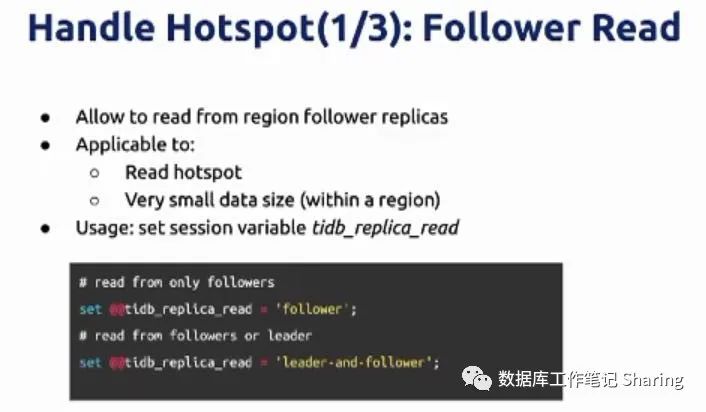• 当设置为 follower 时,TiDB 会选择 Region 的 follower 副本完成所有的数据读取操作。