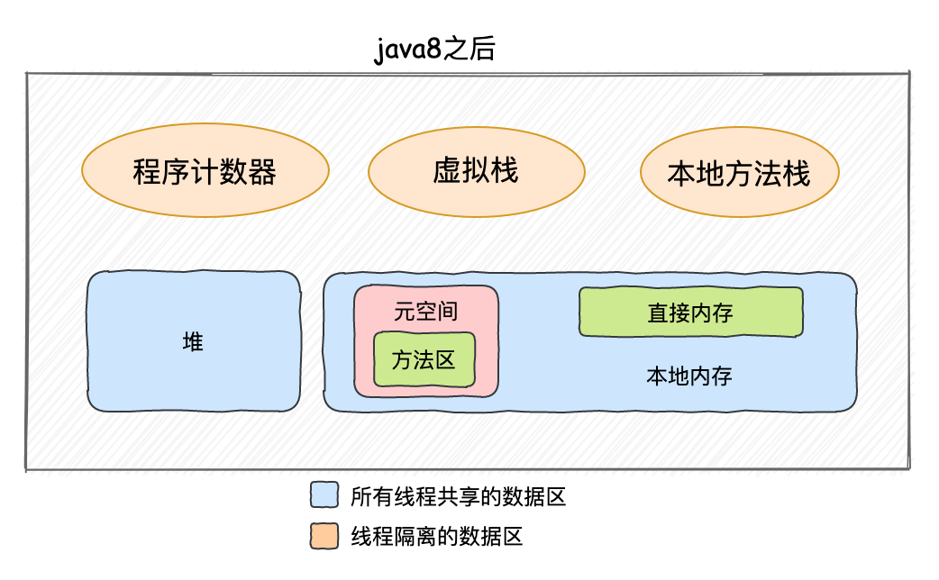而方法区/元空间在 1.8 之后就直接放到本地内存了,假设总内存 2G,JVM 被分配内存 100M, 理论上元空间可以分配 2G-100M = 1.9G,空间还是足够的,所以这块区域也不用管。