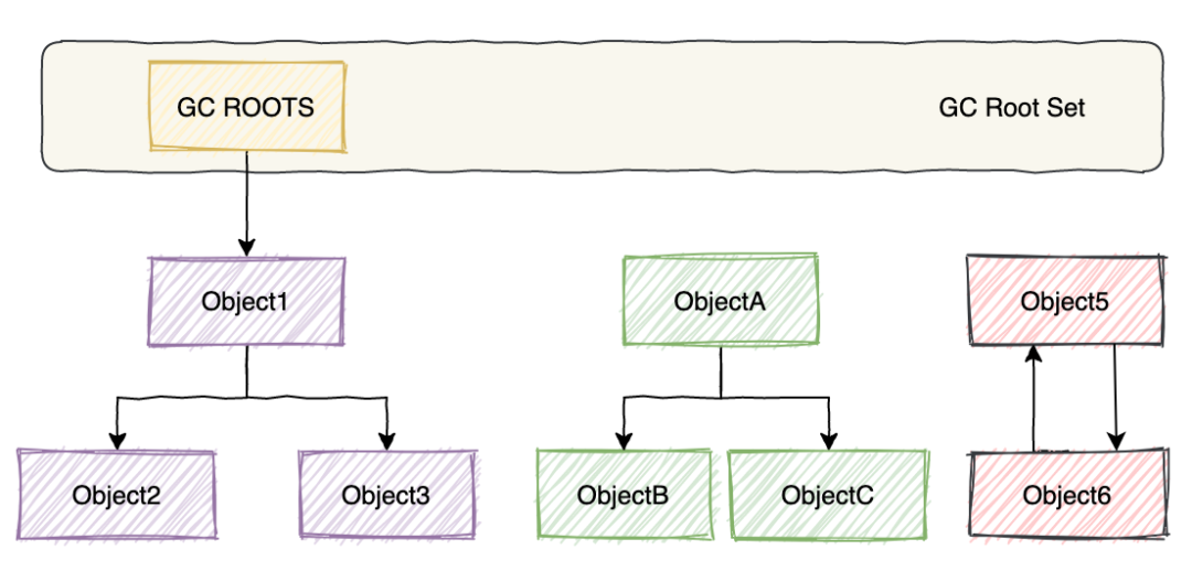 从上图可以看到,即使 Object5 和 Object6 之间相互引用,但是没有 GC Roots 和它们关联,所以可以解决循环引用的问题。