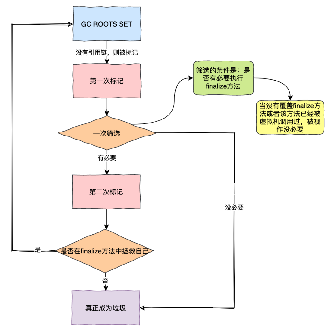 要真正宣告一个对象死亡,至少要经历两次标记过程和一次筛选。