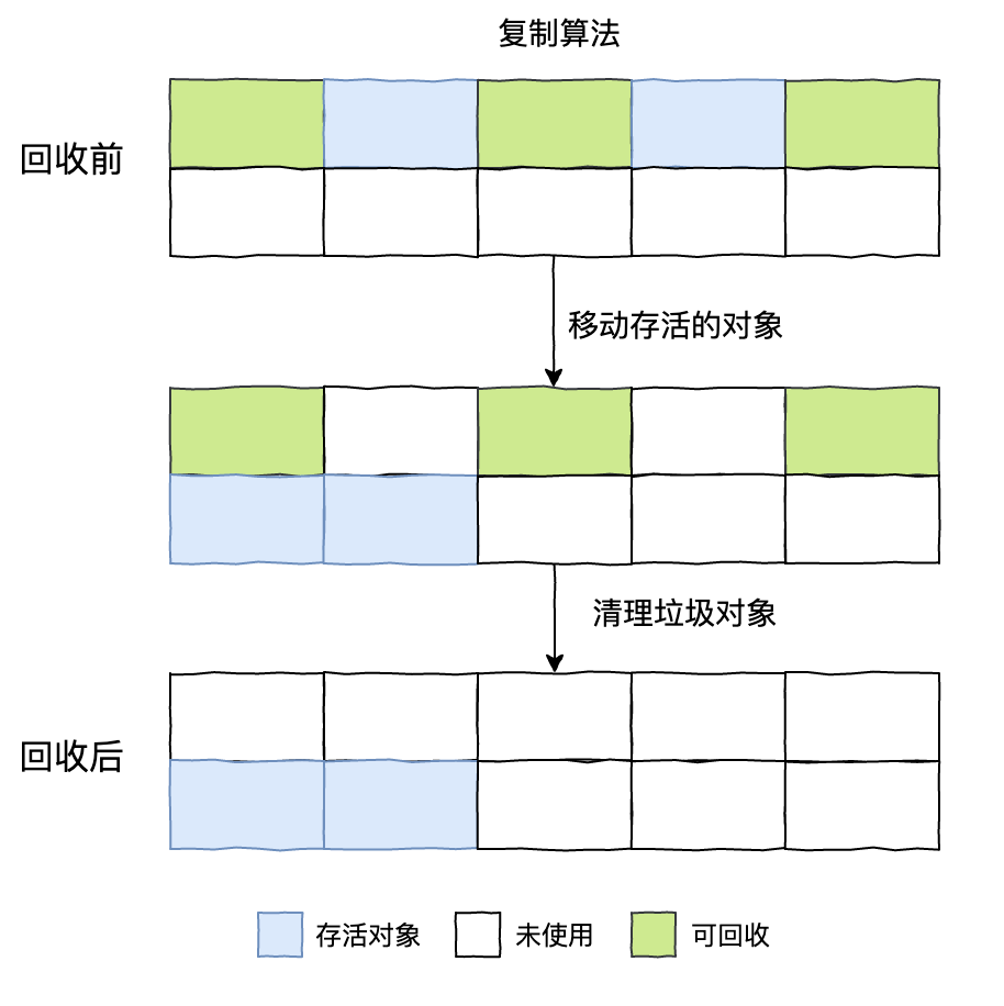 就是将堆分成两块完全相同的区域,对象只在其中一块区域内分配,然后标记出那些是存活的对象,按顺序整体移到另外一个空间,然后回收掉之前那个区域的所有对象。