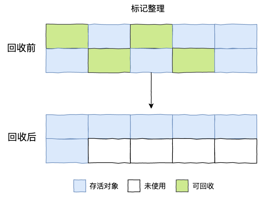 这种算法是,先找到存活的对象,然后将它们向空间的一端移动,最后回收掉边界以外的垃圾对象。