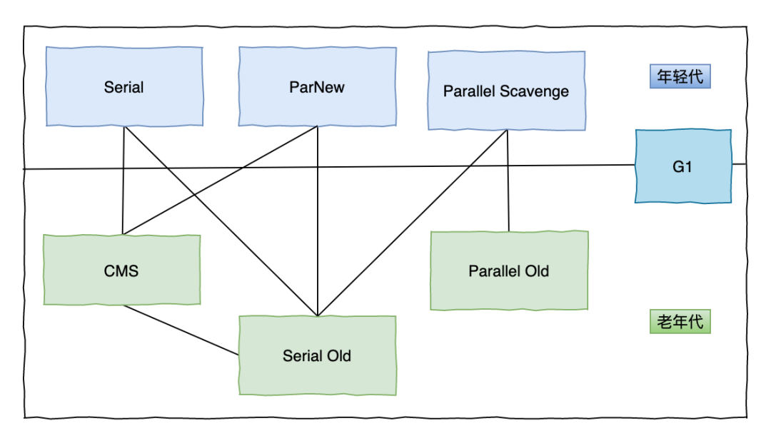 下面是一张很经典的图,展示了 7 种不同分代的收集器,如果两个收集器之间存在连线,说明可以搭配使用。