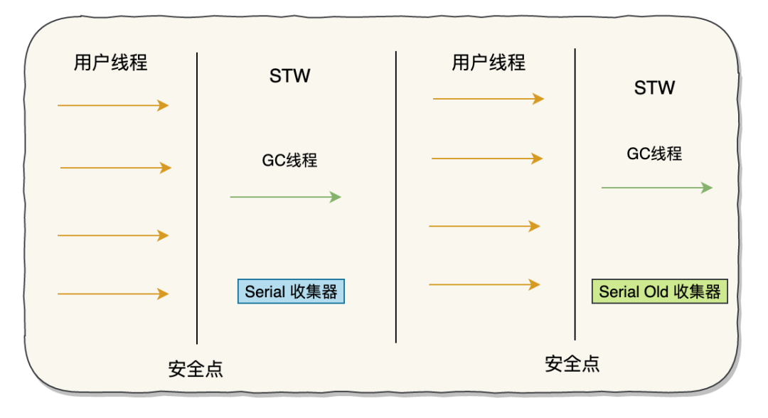 Serial 收集器是工作于新生代的单线程收集器,与之相对地,Serial Old 是工作于老年代的单线程收集器。
