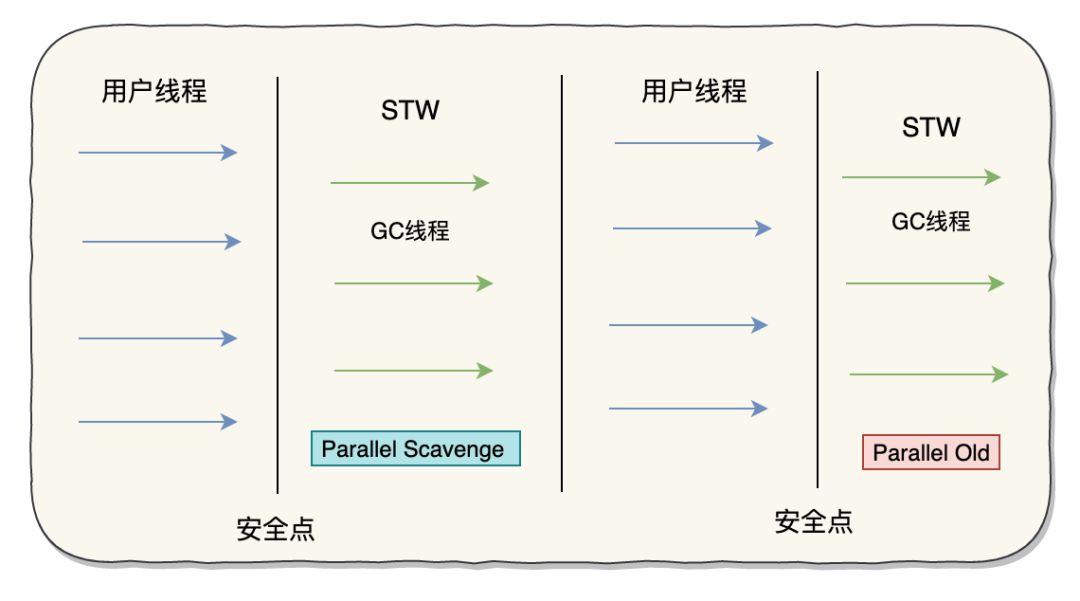 串行:是指垃圾回收线程在进行垃圾回收工作,此时用户线程处于等待状态。