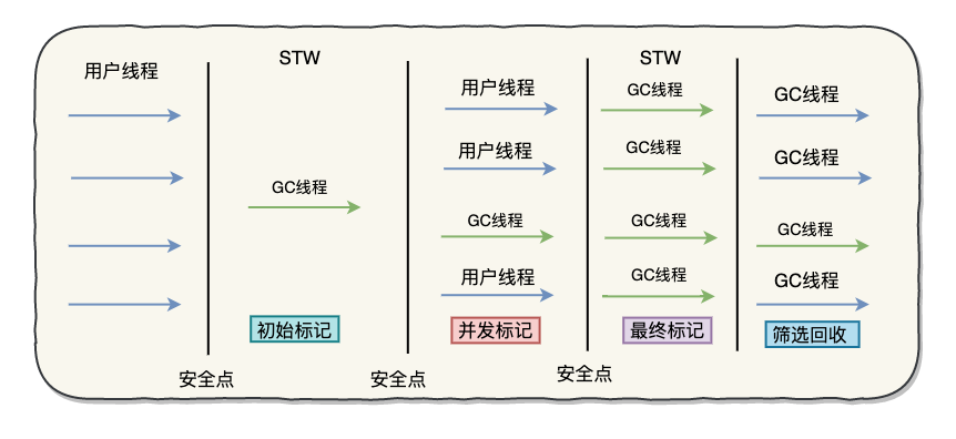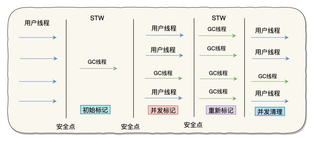 初始标记:标记出来和 GC Roots 直接关联的对象,整个速度是非常快的,会发生 STW,确保标记的准确性。 并发标记:并发标记这个阶段会直接根据第一步关联的对象找到所有的引用关系,耗时较长,但是这个阶段会与用户线程并发运行,不会有很大的影响。 重新标记:这个阶段是为了解决第二步并发标记所导致的标错情况。并发阶段会和用户线程并行,有可能会出现判断错误的情况,这个阶段就是对上一个阶段的修正。 并发清除:最后一个阶段,将之前确认为垃圾的对象进行回收,会和用户线程一起并发执行。