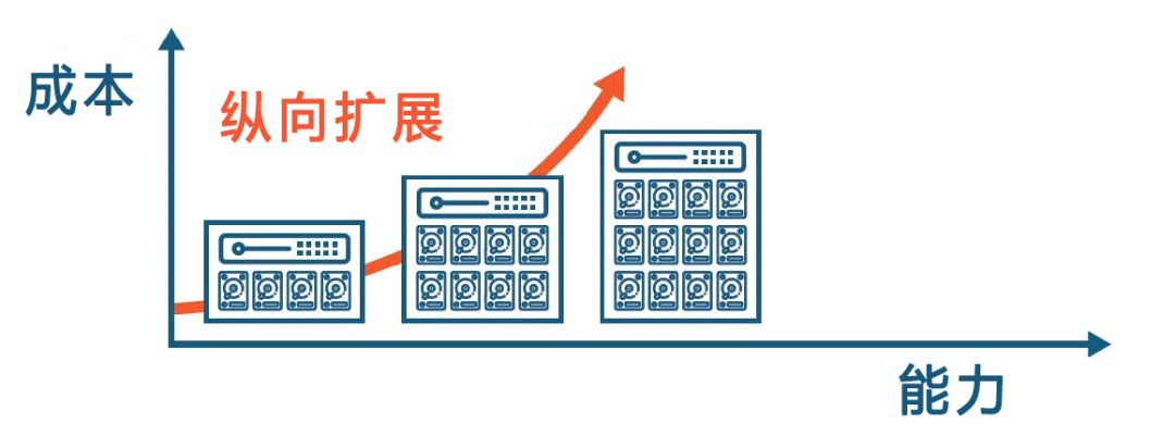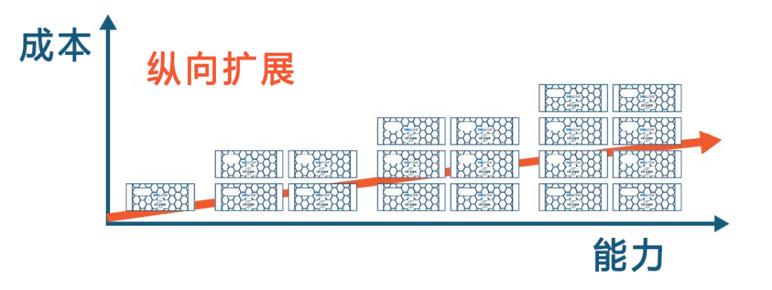 对存储系统来说,由于纵向扩展只是在现有体系结构中添加硬盘或闪盘来增加存储容量,而没有增加CPU、内存来帮助整个系统处理更多的容量交付给主机。这就意味着当存储容量增加后,存储性能往往会下降。