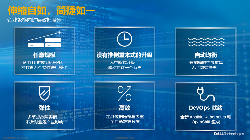 更为重要的是,OneFS操作系统通过单一命名空间、单一文件系统环境和企业级数据服务优势,客户可以通过提高效率和新的自动化功能获得易用性、灵活性和高性能。