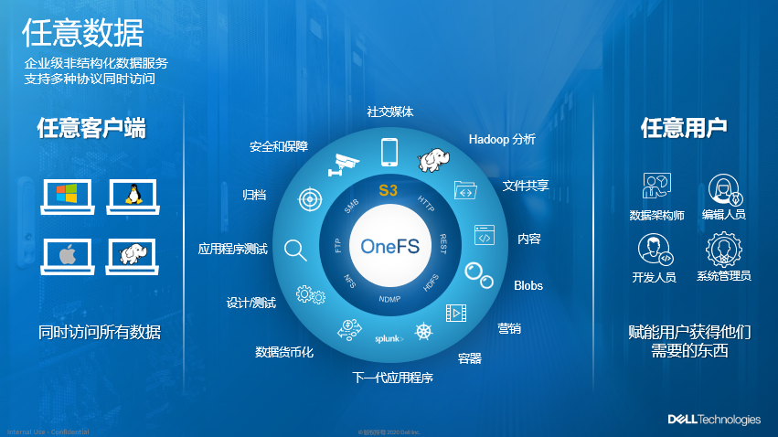任意数据,是指PowerScale支持高达8种协议,包括NFS、SMB、HDFS、S3、REST等,同时可向任意客户端提供访问权限,并支持任意用户的需求。为企业运行的工作负载提供无限的灵活性,这些工作负载既可以使用一种协议存储数据,也能够使用另一种协议访问数据。