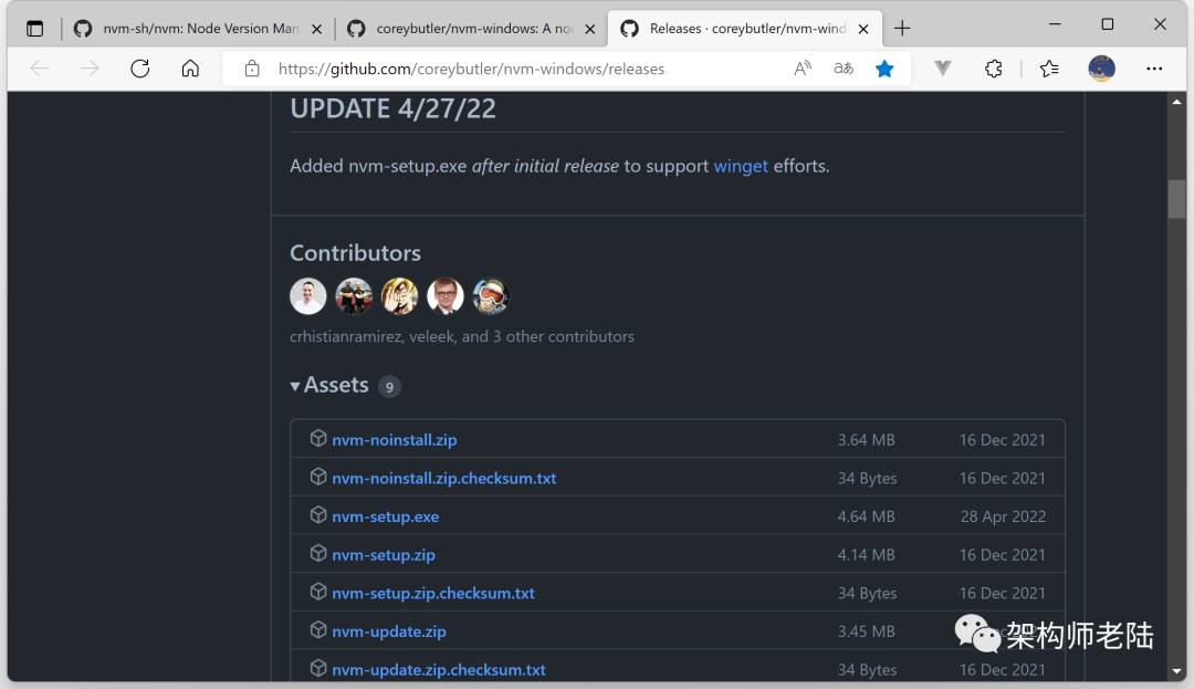 可以通过https://github.com/coreybutler/nvm-windows/releases下载,有三个版本: