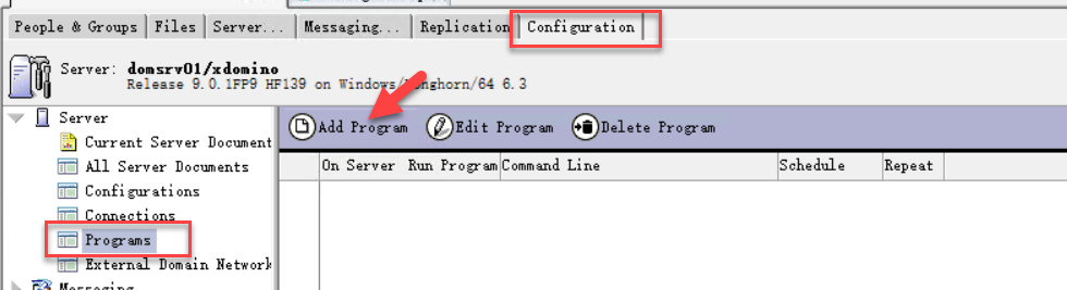 这样就可以归档,不过是手动的,我知道你也嫌麻烦,因此,我们可以设置一个自动任务,打开Domino Administrator管理客户机中选择“配置”选项卡,左边选择程序视图,添加一个程序