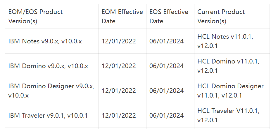 首先是HCL宣布Domino/Notes v9.0.x 和 v10.0.x版本,自2022年12月1日开始停止市场营销,而产品的技术支持和更新将在2024年6月1日,其中包括Notes/Designer/Admin客户机、Domino服务器以及Traveler,如下图: