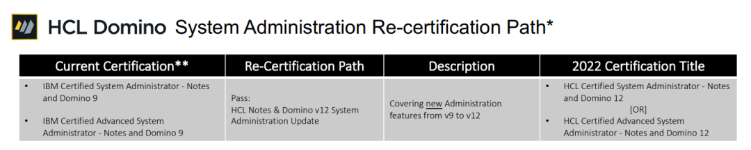 如果以前获得过Domino 9认证的系统管理员只要通过一门新的认证考试《HCL Notes & Domino v12 System Administration Update》,里面涉及的主要是从V9到V12版本以来的新功能,便可以获得HCL认证的Domino 12系统管理专家,如下图: