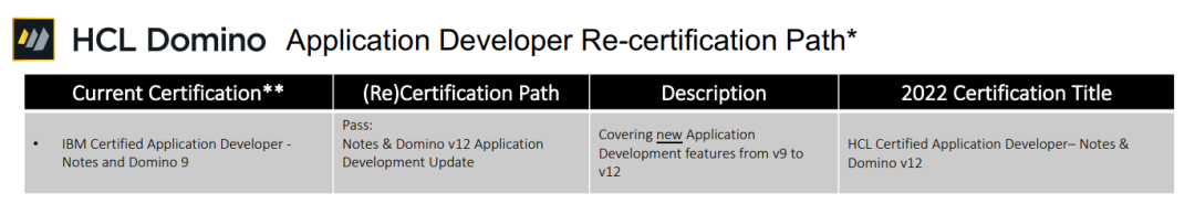 如果以前获得过Domino 9认证的应用开发人员只要通过一门新的认证考试《Notes & Domino v12 Application Development Update》,里面涉及的主要是从V9到V12版本以来的开发新特性,便可以获得HCL认证的Domino 12应用开发专家,如下图:
