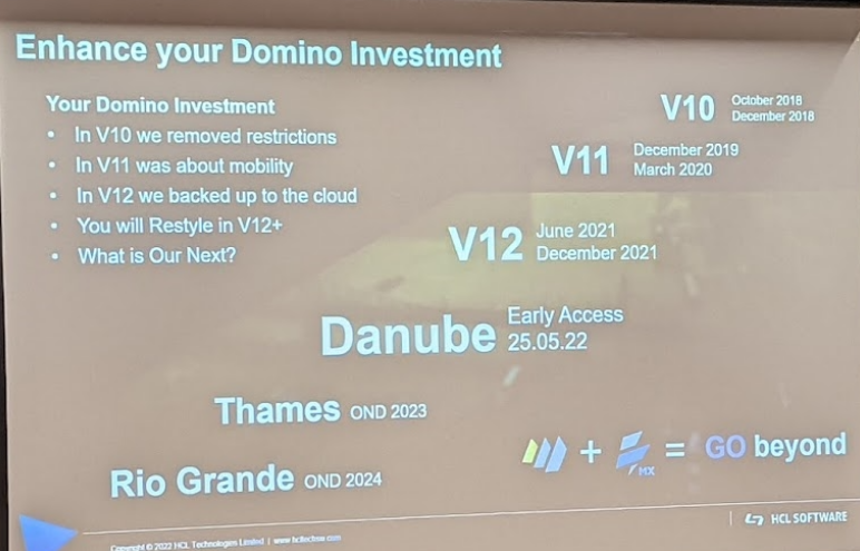 就像很多人说的,今年秋天(2022年9月)将要发布的Domino 多瑙河版本,原本应该称之为Domino 12.0.2,Domino 泰晤士河应该称之为Domino 12.0.3,2024年将发布的Domino Rio Grande才能称之为Domino 13版本。