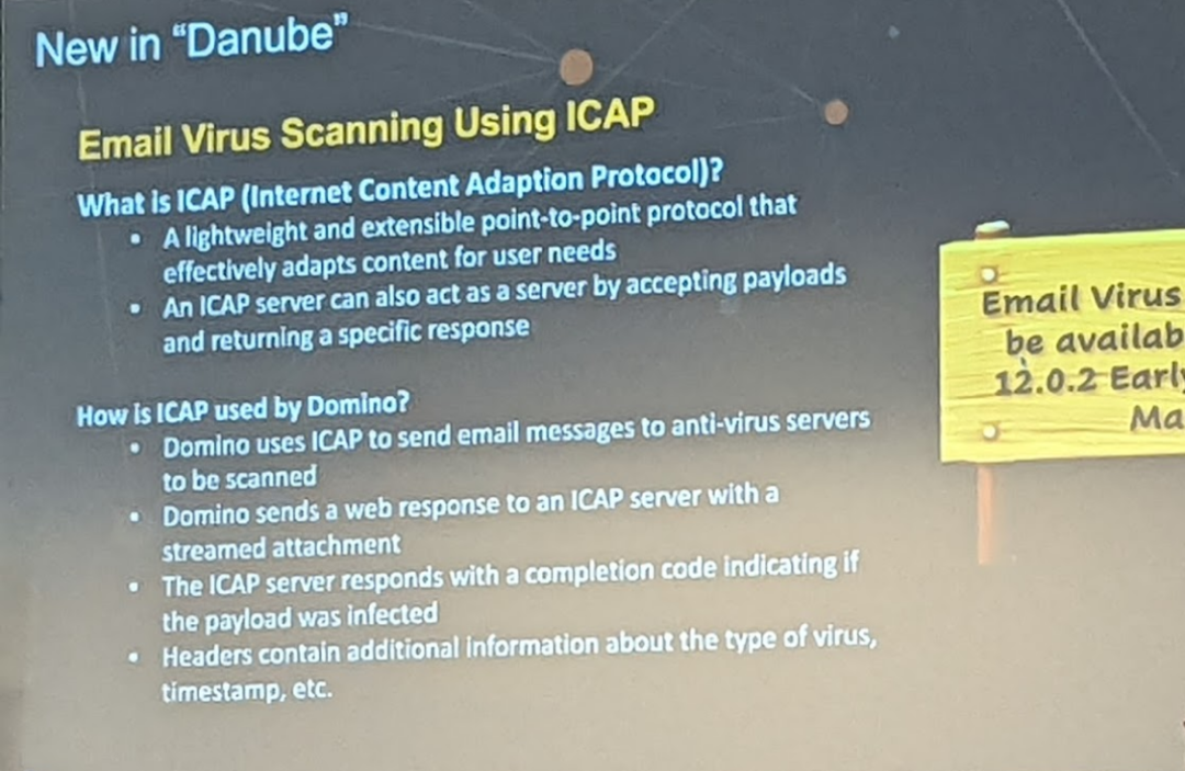 就在本篇撰写过程中,我也看到有人在Linux上安装配置免费的杀毒软件clamav通过ICAP协议,在Domino 12.0.2早期访问版本中(该版本5月25号发布下载)成功配置扫描Domino附件功能,详情请见: