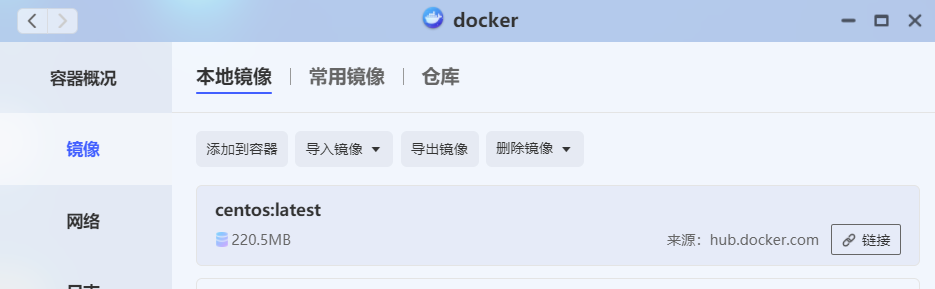 在常用镜像中找到CentOS镜像下载,然后添加到容器中,如下图: