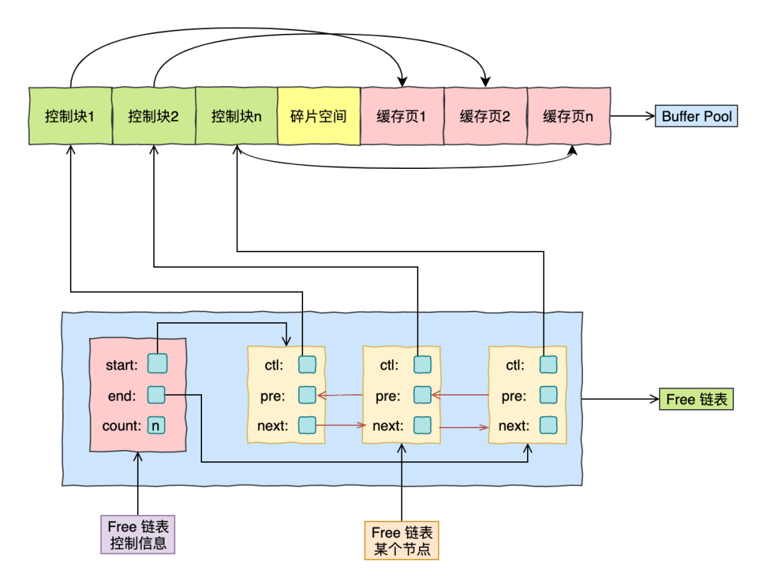 「控制块」和缓存页是一一对应的,它们都被存放到 Buffer Pool 中,其中控制块被存放到 Buffer Pool 的前边,缓存页被存放到 Buffer Pool 的后边。