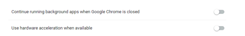 有个办法可以解决整个问题,那就是在Chrome浏览器设置中的两个选项,在Google Chrome -> Settings-> System设置中,找到以下两个选项:“Continue running background apps when Google Chrome is closed”和“Use hardware acceleration when available”,将它们关闭,如下图: