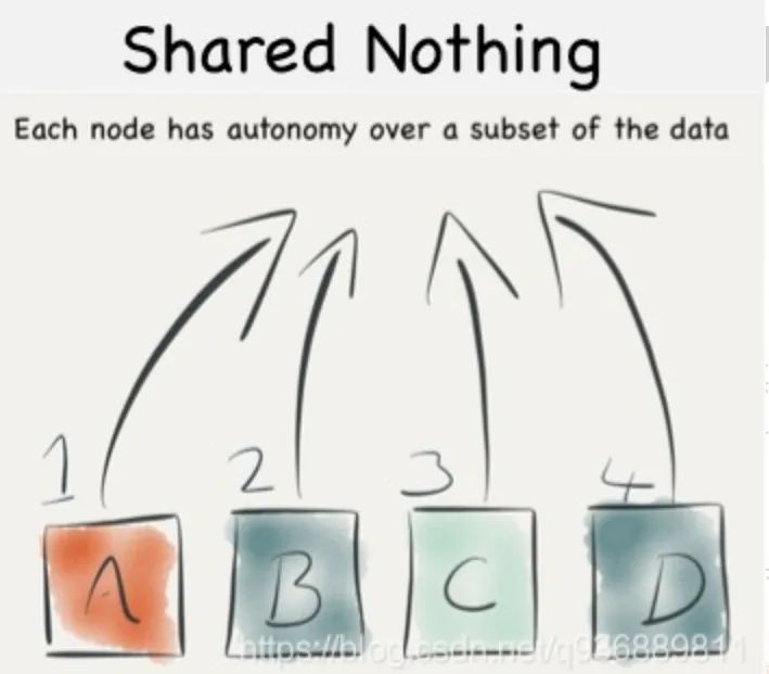 然后大数据套件出来了,比如 Hadoop, 走了 shared-nothing 架构: