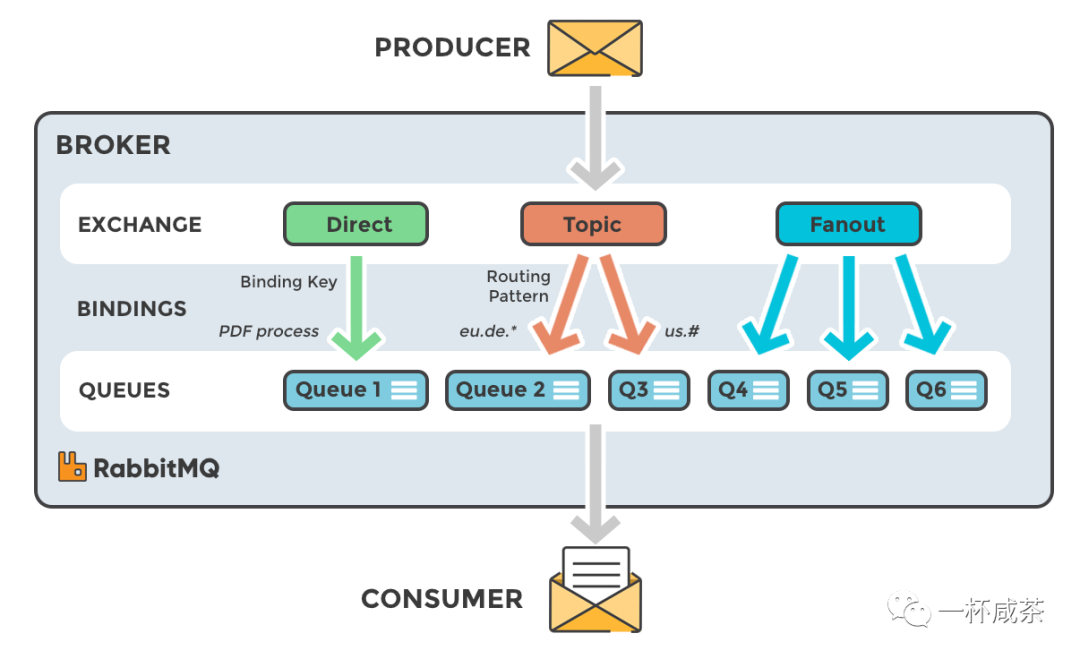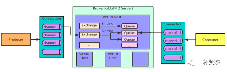 Producer:消息的生产者;生产方客户端将消息同交换机路由发送到队列中 Broker:表示消息队列服务器实体(rabbitmq-server) v-host:Virtual Host虚拟主机。标识一批交换机、消息队列和相关对象。虚拟主机是共享相同的身份认证和加密环境的独立服务器域。每个vhost本质上就是一个mini版的RabbitMQ服务器,拥有自己的队列、交换机,绑定和权限机制。vhost是AMQP概念的基础,必须在链接时指定,RabbitMQ默认的vhost是/ ; 一个Broker中可以设置多个virtual Host,用作不同用户的权限隔离 Exchange:交换器用来接收生产者发送的消息并将这些消息路由给服务器中的队列 Queue:消息队列,用来保存消息直到发送给消费者。它是消息的容器,也是消息的终点。一个消息可投入一个或多个队列。消息一直在队列里面,等待消费者连接到这个队列将消息取走 Binding:绑定,用于消息队列(Queue)和交换机(Exchange)之间的关联(虚拟连接)。一个绑定就是基于路由键将交换机和消息队列链接起来的路由规则,所以可以将交换机理解成一个由绑定构成的路由表。Binding中可以包括多个Routing Key(路由键) Channel:信道,多路复用连接中一条独立的双向数据交流道。信道是建立在真实的TCP连接内地虚拟连接,AMQP命令都是通过信道发出去的,不管是发布消息、订阅队列还是接收消息,这些动作都是通过信道完成的。因为对于操作系统来讲,建立和销毁TCP都是非常昂贵的的开销,所以引入了信道的概念,以复用一条TCP连接, Connection:应用程序与Broker之间的网络连接,比如一个TCP连接 Consuer:消息的消费者(接收消息的程序或进程) Routing Key:路由规则,虚拟机通过它来确认如何路由一个特定的消息