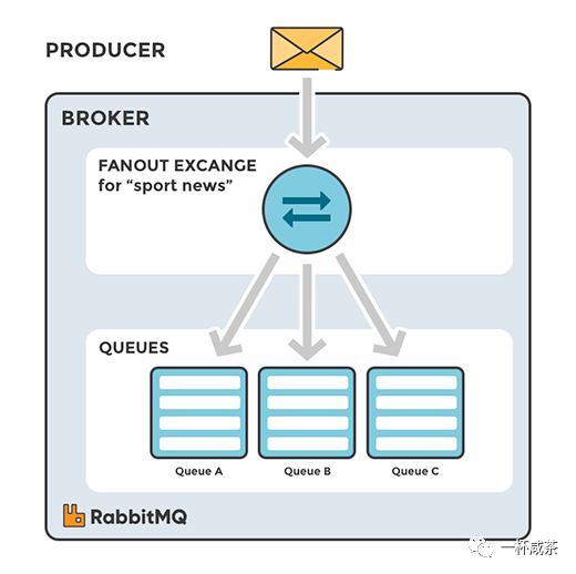 Fanout(扇形交换机):不处理routekey,直接把消息路由到绑定到它的所有队列中