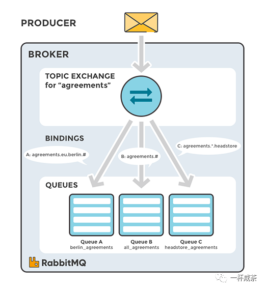 Topic(话题交换机):在“路由键”和“绑定中指定的路由模式”之间进行通配符匹配;根据routeKey把消息转发到符合规则的队列中,其中#用于匹配符合一个或者多个词(范围更广),*用于匹配一个词。