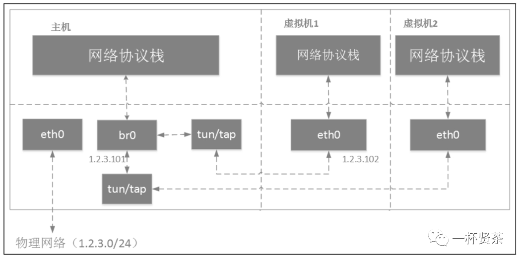 虚拟机通过tun/tap或者其他类似的虚拟网络设备,将虚拟机内的网卡同br0连接起来,这样就达到和真实交换机一样的效果,虚拟机发出去的数据包先到达br0,然后由br0交给eth0发送出去,数据包都不需要经过host机器的协议栈,效率高。如果有多个虚拟机,那么这些虚拟机通过tun/tap设备连接到网桥。