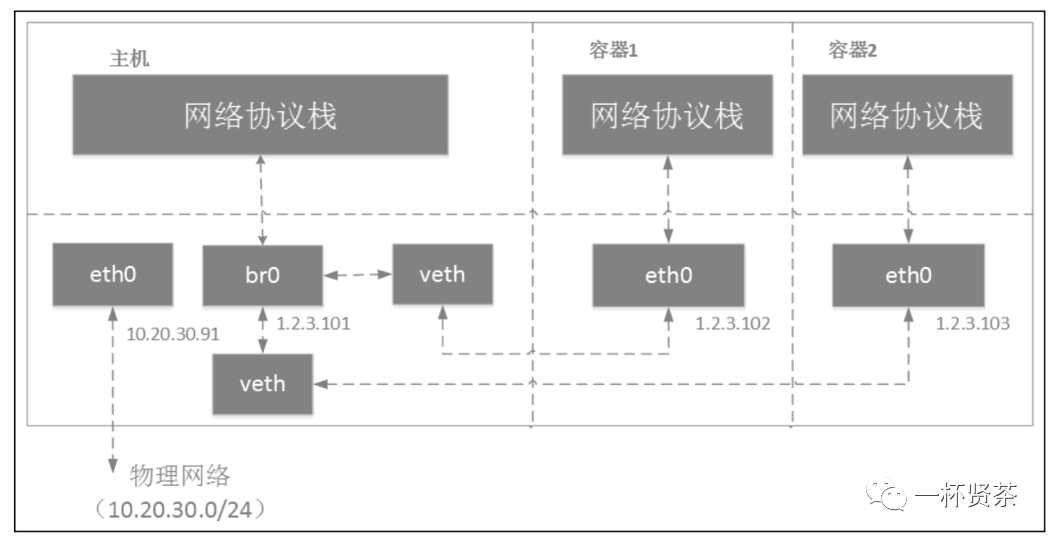 容器运行在自己单独的network namespace里,因此都有自己单独的协议栈。Linux bridge在容器场景的组网和上面的虚拟机场景差不多,但也存在一些区别。例如,容器使用的veth pair设备,而虚拟机使用的是tun/tap设备。在虚拟机场景下, 我们给主机物理网卡eth0分配了ip地址;而在容器场景下,一般不会对宿主机eth0进行配置。在虚拟机场景下,虚拟机一般会和主机在同一网段;而在容器场景下,容器和物理网络不在同一网段内。Linux bridge在容器中的应用如下图: