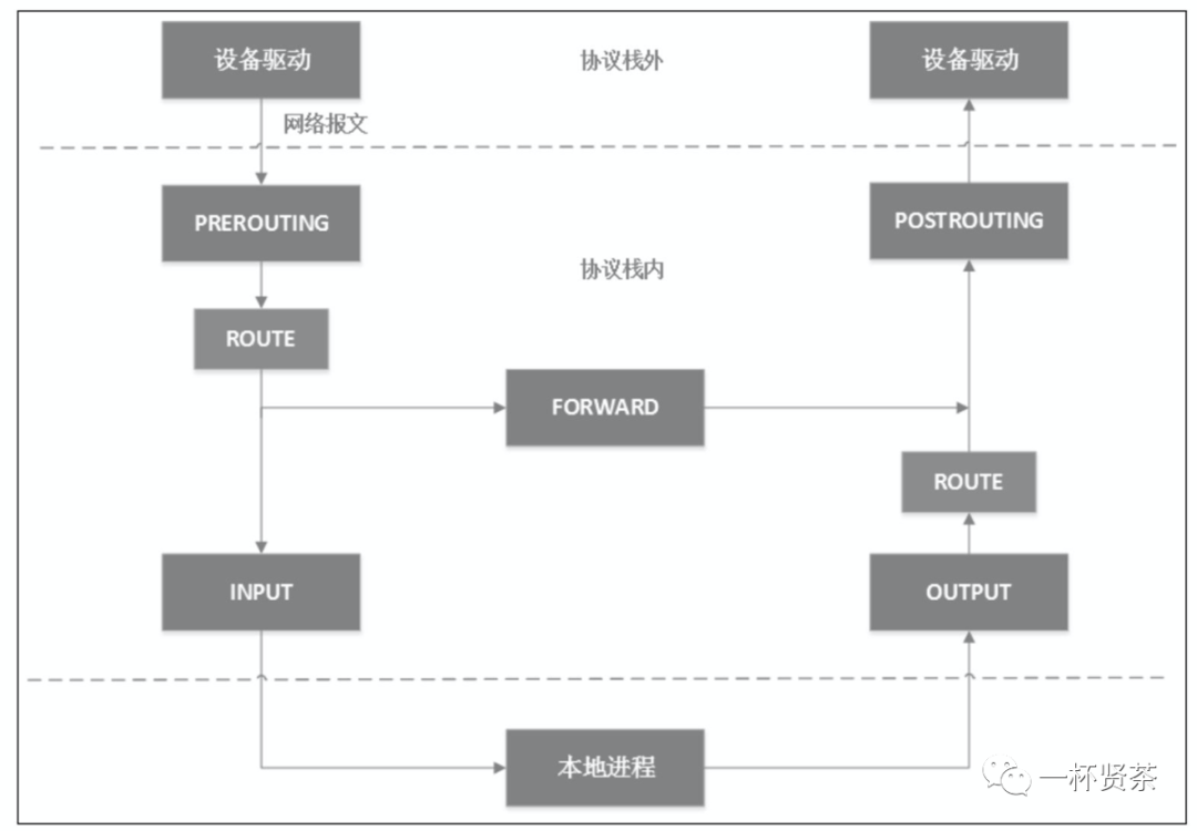 IP层的5个钩子点的位置,对应iptables就是5条内置链,分别是PREROUTING、POSTROUTING、INPUT、OUTPUT和FORWARD