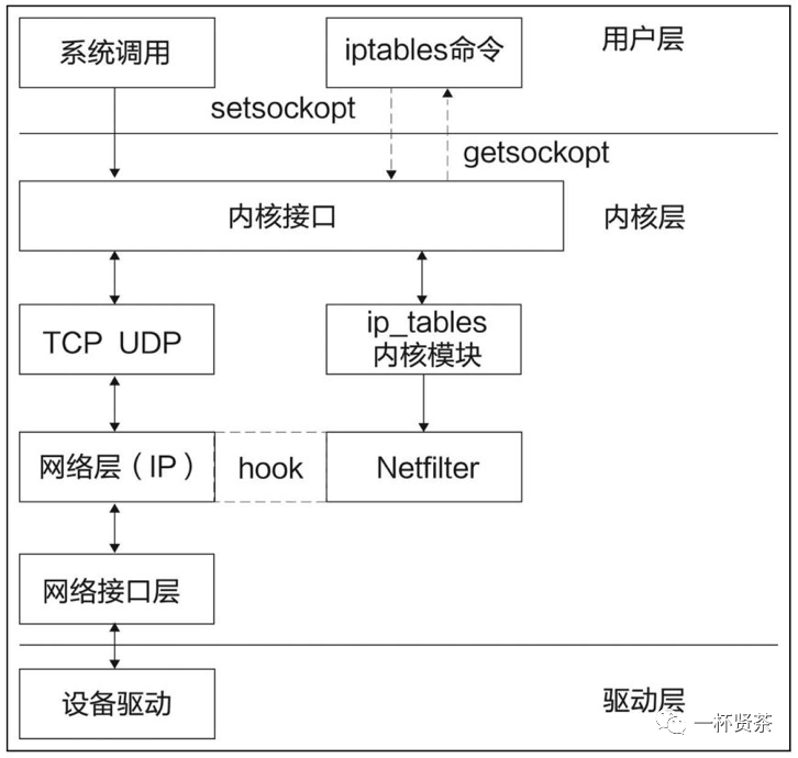 iptables的底层实现是netfilter。netfilter是Linux内核2.4版引入的一个子系统。它作为一个通用的、抽象的框架,提供一整套hook函数的管理机制,使得数据包过滤、包处理(设置标志位、修改TTL等)、地址伪装、网络地址转换、透明代理、访问控制、基于协议类型的链接跟踪,甚至带宽限速等功能成为可能。netfiliter的架构就是在整个网络流程的若干位置放置一些钩子,并在每个钩子上挂在一些处理函数进行处理。