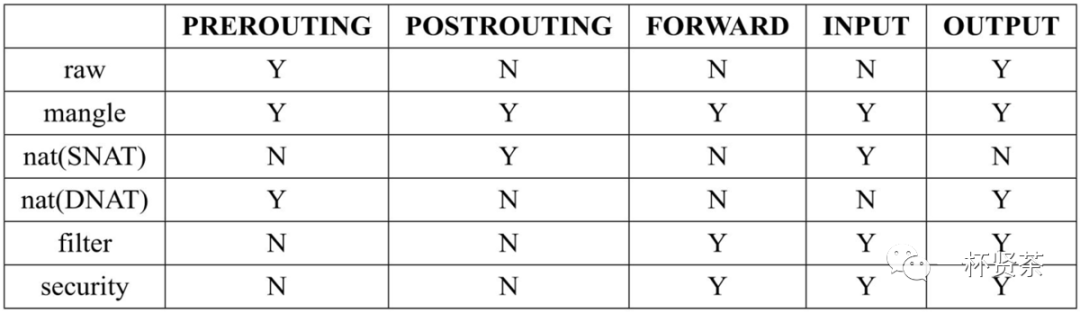 不是每个链上都能挂表,iptables表与链的对应关系如下图所示: