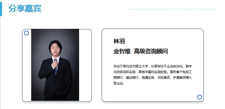 金智维高级咨询顾问林羽带来的分享是《金智维K-RPA软件机器人解决方案》。林羽谈到在信息化的大背景下,企业运营呈现出系统繁杂、架构各异、缺乏互通、为系统打工的现状,业务与IT部门之间的矛盾不易调和。RPA的全面自动化、对原有系统零改造、AI快速应用落地的三大本质,为企业的快速发展带来了更多可能。此外RPA所具备的全天候自动执行和零错误率的特性,实现了企业的降本提质增效和人力资源释放,成为企业数字化转型最有效的技术平台。金智维是一家专注于企业级RPA技术的人工智能公司,以“RPA+AI+大数据”为核心技术,在国内率先推出具有自主知识产权的 RPA 软件机器人,迄今已服务医疗、地产等多个行业的300+企业客户,是企业数字化转型过程中的“黄金搭档”。