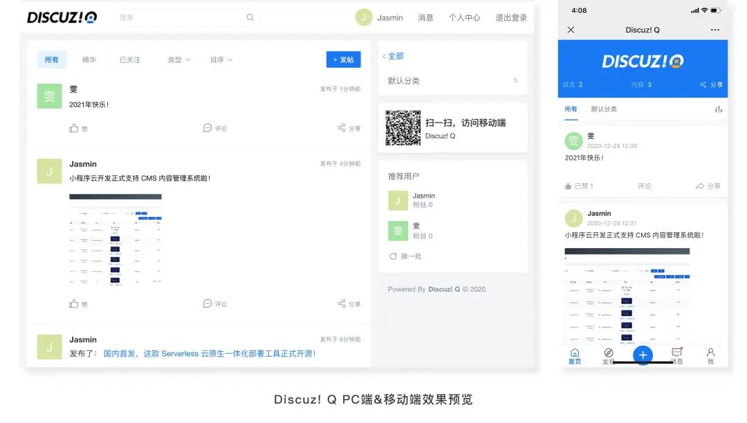 先上结论:腾讯云开发,支持一键部署 Discuz! Q ,使用TDSQL-C(原CynosDB)的serverless服务,按量计费,不用不要钱。自2020年10月云开发支持一键部署 Discuz! Q 以来,就受到了众多开发者的支持和喜爱,不少开发者用来搭建游戏社区、社交电商、招聘信息发布平台,玩得不亦乐乎。同时,也有小伙伴提出了一系列问题,例如用云开发部署 Discuz! Q ,一个月大概收费是多少、欠费了会怎样、流量会被刷吗、是否支持二次开发等。本文就整理了近期云开发一键部署 Discuz! Q 更新的重磅能力,并集中解答开发者最关心的问题。云开发是腾讯云推出的云原生一体化应用开发平台,可以用于开发小程序、Web、移动应用,到目前为止已服务超过100万开发者。通过云开发推出的新一代云原生应用引擎——云托管部署 Discuz! Q,同时兼容 PC 端和移动端的适配。并具备以下特性: