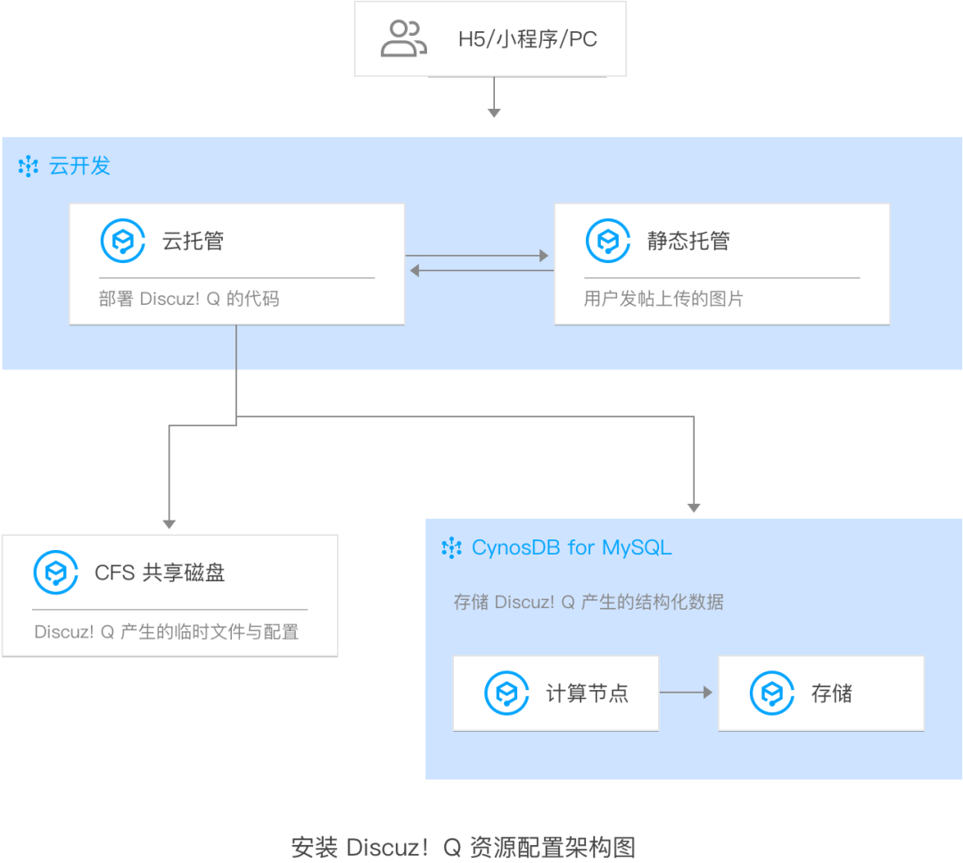 1、腾讯云数据库TDSQL-C(原CynosDB)上线Serverless服务用云开发部署 Discuz! Q,除了可以享受云开发天然具备的按量计费、Serverless 无服务器化等特性,现在只需要一键点击,即可把 Discuz! Q 依赖的 TDSQL-C(原CynosDB)切换到 Serverless 模式,进一步降低搭建应用的费用。已经通过云开发部署 Discuz! Q 的用户,可以到数据库控制台,找到集群名为 DiscuzCynosDB 的实例,点击「按量转Serverless」即可迁移到数据库的 Serverless 服务。https://cloud.tencent.com/document/product/876/51079#serverlessmysql若目前 Discuz! Q 默认配置的功能不能满足业务的场景也不用担心,云开发部署 Discuz! Q 已支持二次开发,可通过官方代码包进行二次开发。*注:在二次开发前,建议先对云托管有一个简单的了解:云托管是云开发提供的新一代云原生应用引擎(App Engine 2.0),支持托管任意语言和框架编写的容器化应用,用户可面向代码/镜像等多种方式使用,无需维护复杂的容器环境,可专注于自身的业务。https://github.com/TencentCloudBase-Marketplace/Discuz-Q通过云开发部署 Discuz! Q,会默认配备一个三级域名。但如果应用需要对外开放使用,建议你购买域名并完成备案。虽然备案本身不需要收费,但在过去,备案前大多数都需要先购买一台服务器,而现在,如果你的云开发环境里部署了 Discuz! Q,而且环境中购买了云托管资源包(剩余有效期大于等于90天),即可无需额外购买服务器,享受域名备案服务!总的来说,通过一键部署 Discuz! Q 活动页购买续费云托管资源包,不但能抵扣 Discuz! Q 运行时消耗的云托管资源,还可以完成备案流程。https://cloud.tencent.com/act/pro/cloudbase-beian除了介绍近期更新的能力,我们还收集了一些高频问题,在此一一解答。问:用云开发部署 Discuz! Q 有哪些收费项?费用是怎么算的?答:云开发部署Discuz! Q,主要用了云托管、静态托管、文件存储 CFS、云数据库 CynosDB for MySQL,各资源项的分工如下:各项资源都将按使用量计费,如果站点一直无流量访问,云托管将于半小时内缩容到0,若数据库使用的是 Serverless 模式,随后数据库用量也会降为0。因此很难估算费用需要多少,需要结合业务规模和访问频次才能准确计算费用。但这种计费模式以及云开发自动扩缩容的特性,无论对访问量低的个人尝鲜还是流量波动大的业务活动推广,都带来更低成本、更省心的体验。