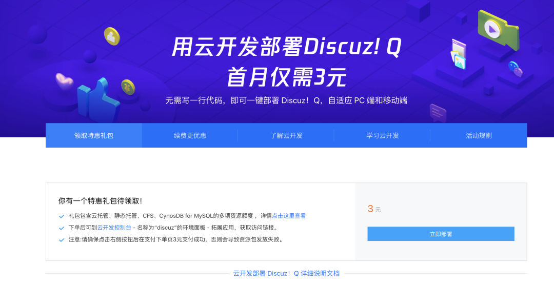云开发部署 Discuz! Q 优惠活动仍火热进行中,点击文末左下方的「阅读原文」,立即进入页面购买体验或享受续费优惠。