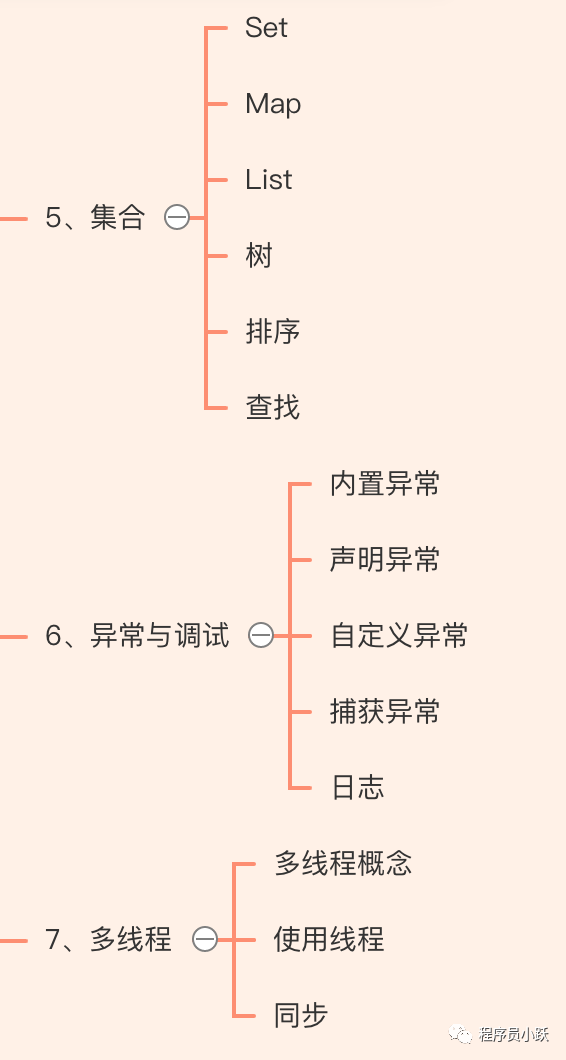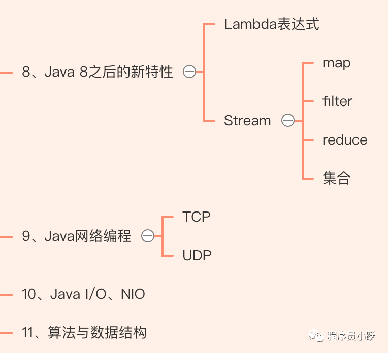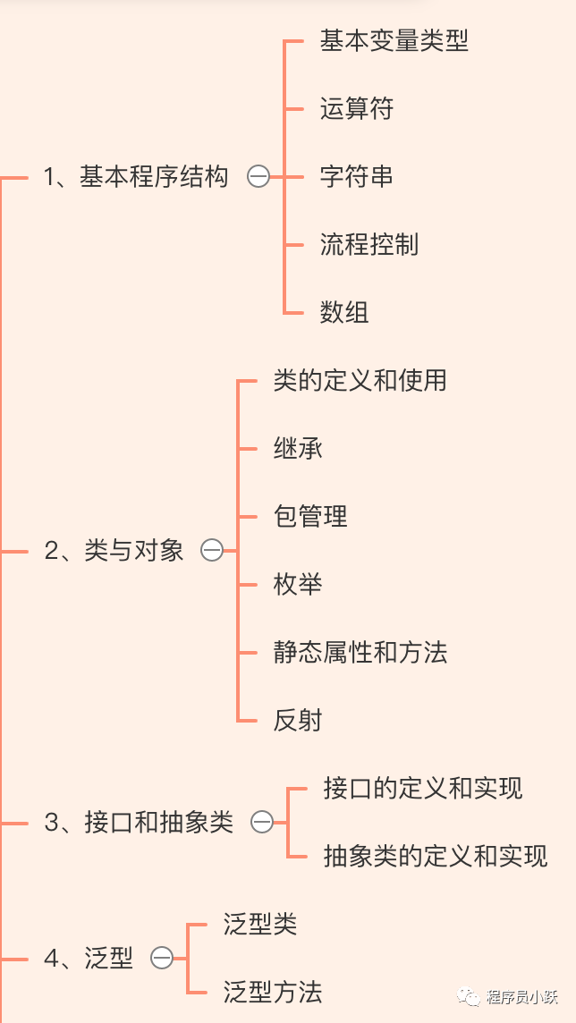 基本程序结构:基本变量类型、运算符、字符串、流程控制、数组 类与对象:类的定义和使用、静态属性和方法、继承、包管理、枚举、反射 接口和抽象类:接口的定义及实现、抽象类的定义及实现 泛型:泛型类、泛型方法 集合:Set、List、Map、树、排序和查找 异常与调试:内置异常、声明异常、自定义异常、捕获异常、日志 多线程:多线程概念、使用线程、同步 Java 8 之后的新特性:Lambda表达式、Stream(map、filter、reduce、集合) Java 网络编程:TCP、UDP Java I/O、NIO 算法与数据结构