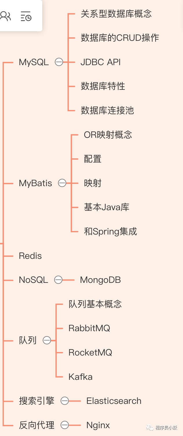 MySQL:关系型数据库概念,数据库的CRUD操作、JDBC API、数据库特性,数据库连接池 MyBatis:OR映射概念,配置,映射,基本Java库,和Spring集成 缓存:缓存概念、Redis的使用、缓存雪崩、缓存穿透、缓存击穿 NoSQL:NoSQL概念,Mongodb的使用 队列:队列概念,RabbitMQ、Kafka 搜索引擎:Elasticsearch 反向代理:反向代理概念,Nginx的配置和使用