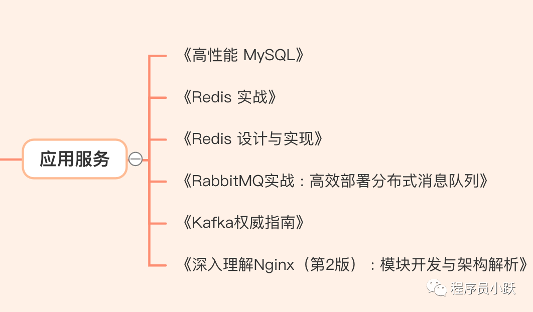 《高性能 MySQL》(豆瓣评分 9.3,0.4K+人评价):mysql 领域的经典之作,拥有广泛的影响力。不但适合数据库管理员(dba)阅读,也适合开发人员参考学习。不管是数据库新手还是专家,相信都能从本书有所收获。 《Redis 实战》:如果你想了解 Redis 的一些概念性知识的话,这本书真的非常不错。 《Redis 设计与实现》(豆瓣评分 8.5):跃哥学习 Redis 的时候,除了看官网,捧在手里的就是这本书啦。 《RabbitMQ实战 : 高效部署分布式消息队列》也是 《RabbitMQ in Action : Distributed Messaging for Everyone》的中文版。最近在学习的时候,也看到老师推荐书单,有位老师就说,《xx in Action》这种书籍是经典书籍,很适合大家看,哈哈,这个不假,后面我还要推荐几本 xx in Action。 《Kafka权威指南》 《深入理解Nginx(第2版) : 模块开发与架构解析》