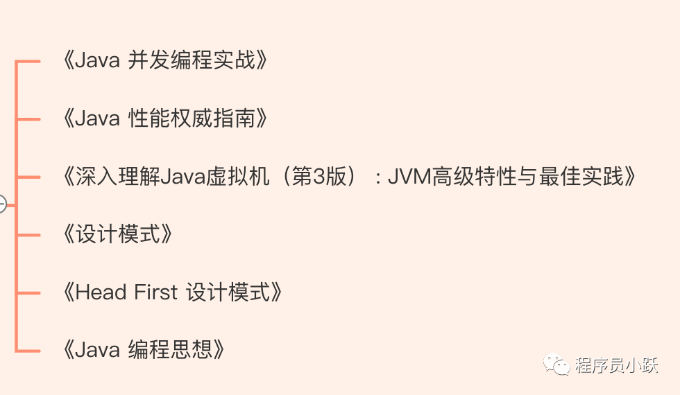 《Java 并发编程实战》,是一本完美的 Java 并发参考手册。这样解释简单明了吧,哈哈 《Java 性能权威指南》了解如何编写出并发的程序,你还需要了解一下如何优化 Java 的性能,这本书比较合适。通过学习,你可以比较大程度地提升性能测试的效果。其中包括:使用 JDK 中自带的工具收集 Java 应用的性能数据,理解 JIT 编译器的优缺点,调优 JVM 垃圾收集器以减少对程序的影响,学习管理堆内存和 JVM 原生内存的方法,了解如何最大程度地优化 Java 线程及同步的性能,等等(这段摘抄耗子叔的《左耳听风》专栏)。 看完上面那本书,如果还有余力,那么继续深入,《深入理解Java虚拟机(第3版) : JVM高级特性与最佳实践》这本书是周志明老师写的,已经到第三版了,跃哥学习过第二版,学完就飘了,看懂的话,得翻阅好几次。 设计模式就不解释了,学 Java 你一定要学面向对象的设计模式,经典中的经典自然就是《设计模式》。如果你觉得有点儿难度了,那么可以看一下《Head First 设计模式》。 如果你想学好 Java,再去啃一啃《Java 编程思想》也无妨。真是一本透着编程思想的书。上面的书让你从微观角度了解 Java,而这本书则可以让你从一个宏观角度了解 Java。