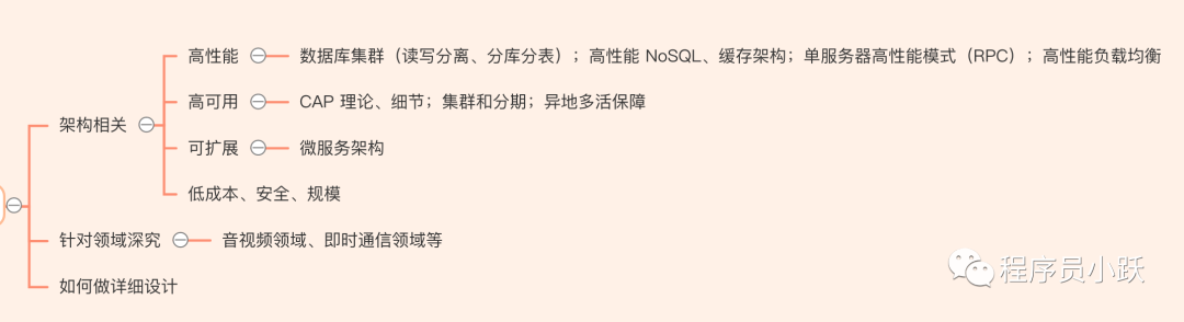 架构基础:高性能、高可用、可扩展性、低成本、安全、规模 高性能架构模式:数据库集群(读写分离、分库分表);高性能 NoSQL、缓存架构;单服务器高性能模式(RPC);高性能负载均衡 高可用架构:CAP 理论、细节;集群和分期;异地多活保障 可扩展架构:目前主要是微服务架构 针对领域深究(比如音视频领域、即时通信领域) 如何做详细设计