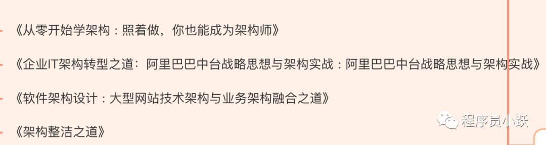 《从零开始学架构 : 照着做,你也能成为架构师》这本书是我看的第一本架构书,针对业务系统的架构设计,贴近日常工作,有自己的一套方法论,还是比较实用的 《企业IT架构转型之道:阿里巴巴中台战略思想与架构实战 : 阿里巴巴中台战略思想与架构实战》 《软件架构设计 : 大型网站技术架构与业务架构融合之道》 《架构整洁之道》