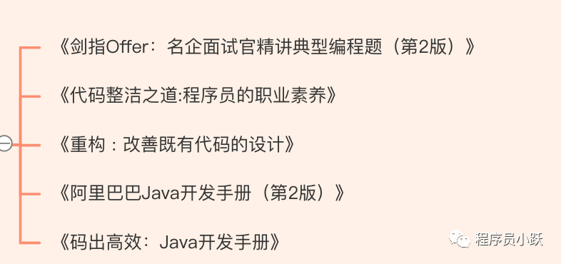 《剑指Offer:名企面试官精讲典型编程题(第2版)》跃哥周围很多小伙伴,就是看了这本书的知识巩固,成了 offer 收割机 《代码整洁之道:程序员的职业素养》这本书在我大学的时候老师就不停地开始推荐,工作之后也是一直被推荐,不得不看 《重构 : 改善既有代码的设计》旧版新版都很 OK,重构是门技术活噢 《阿里巴巴Java开发手册(第2版)》一出来的时候就风靡了,还顺带出了编译器的插件,你安装了吗? 《码出高效:Java开发手册》这本书源于影响了全球250万名开发工程师的《阿里巴巴Java开发手册》,作者静心沉淀,对Java规约的来龙去脉进行了全面而彻底的内容梳理,配合着看妥妥的